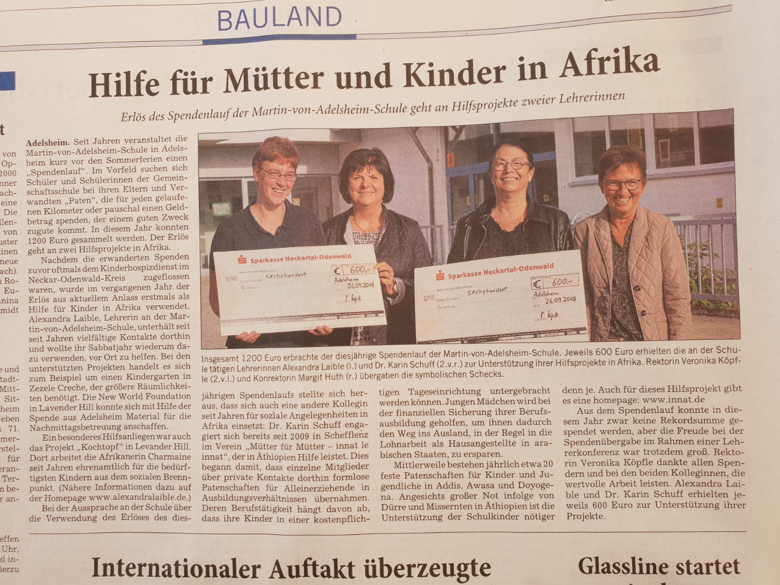 Während ich noch in der Weltgeschichte unterwegs war, haben sich die Schülerinnen und Schüler zu einem weiteren Spendenlauf aufgemacht. Die insgesamt 1200 "erlaufenen" Euro wurden fair aufgeteilt. In den Fränkischen Nachrichten sowie in der Rhein-Neckar-Zeitung war jeweils ein Artikel über die Spendenübergabe zu sehen. Vielen Dank an alle, die unsere Projekte auch noch ein weiteres Mal unterstützen.
